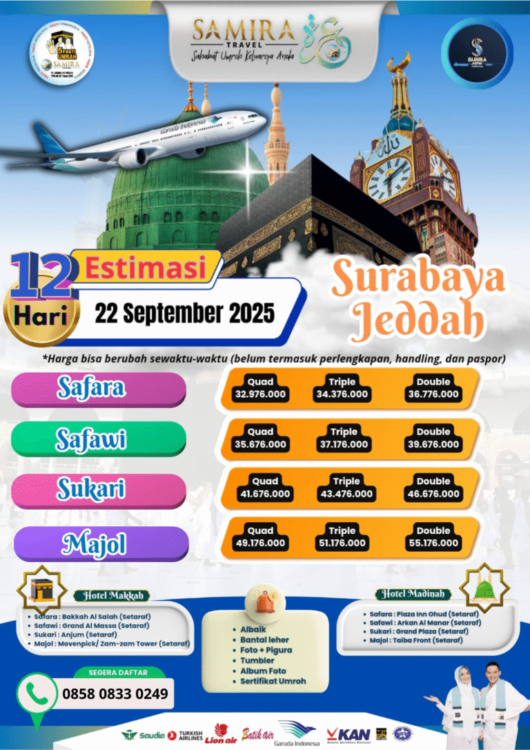 Nikmati perjalanan spiritual Umroh bersama Samira Travel dengan pelayanan terbaik dan fasilitas eksklusif. Paket ini dirancang khusus untuk memberikan kenyamanan dan kekhusyukan selama beribadah di Tanah Suci. Bersama maskapai ternama dan hotel berbintang, perjalanan Anda akan lebih bermakna dan tak terlupakan.